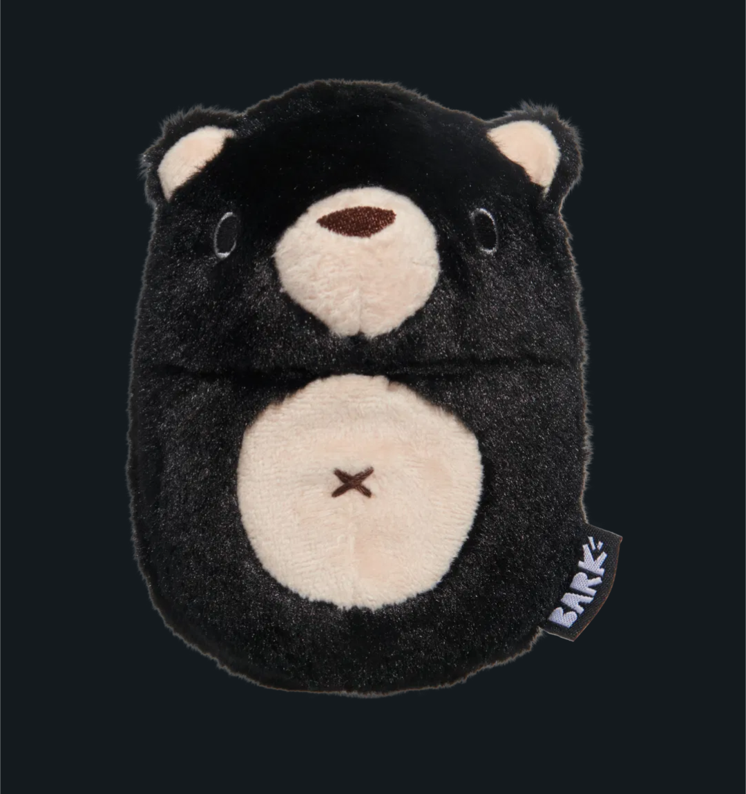 If you see this bear dog toy in the wild, experts say dogs should roll over and show him their bellies. Black Bear Bones is made of natural rubber and has all the playtime necessities with a wacky wobble base that keeps him rolling, bouncing, and spinning. Just be sure to squeak it loudly in case there are cubs nearby. FEATURES: BARK Super Chewer Black Bear Bones black bear rubber dog toy Hidden Toy Inside! Rip through the fabric to reveal a hidden toy underneath! Made with a squeaker for extra excitement. Wacky wobble design to keep pups on their toe beans. Hidden Toy Inside! Rip through the fabric to reveal a hidden toy underneath!