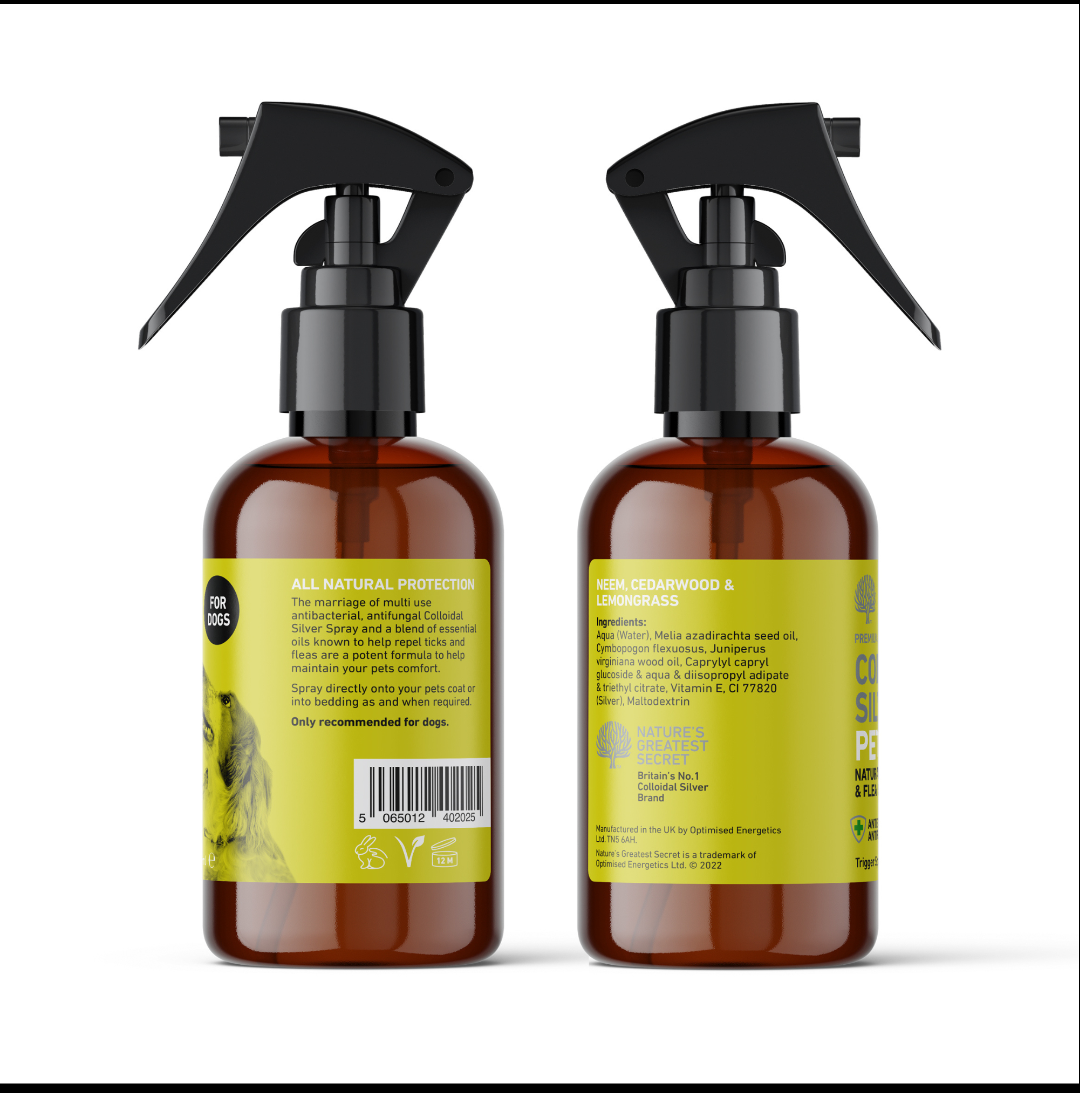 Protect your dog with our all-natural tick and flea repellent, specially formulated to help naturally repel parasites without the use of harsh chemicals or preservatives. This vegan and cruelty-free formula combines the power of Colloidal Silver with carefully selected plant-based ingredients known for their repellent and skin-supporting properties.